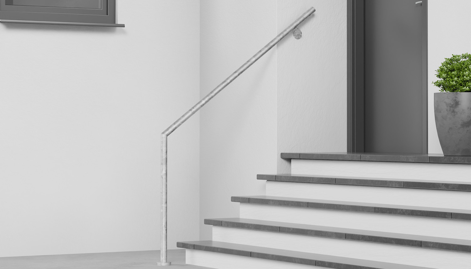 Treppenhandlauf verzinkt und wahlweise Farbbeschichtet zur einfachen Selbstmontage. Das Treppengeländer wird seitlich an der Hauswand und auf der Treppe bzw. den Treppenstufen oder vor der Treppe montiert. Fertigung in traditioneller Handarbeit in Deutschland. Der Treppenhandlauf verzinkt zeichnet sich durch seine Langlebigkeit und Korrosionsbeständigkeit aus.