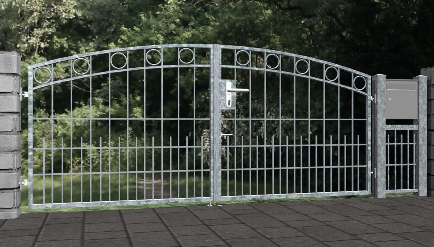 De dubbelvleugelige tuinpoort met bovenboog is vervaardigd uit verzinkt staal en heeft een invulling van massief traliewerk met discrete ringornamenten. De combinatie van robuuste textuur en eenvoudige versiering geeft de deur een unieke uitstraling en een hoge weerstand. Het geïntegreerde brievenbuselement maakt het ideaal voor de ingang. Verdere productdetails vindt u in de onderstaande beschrijving.